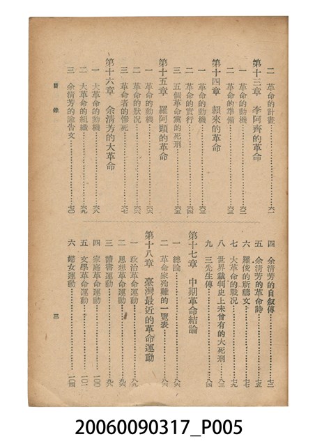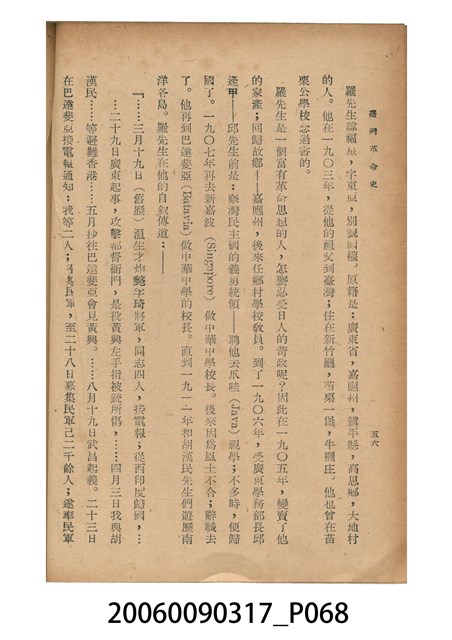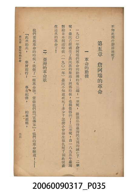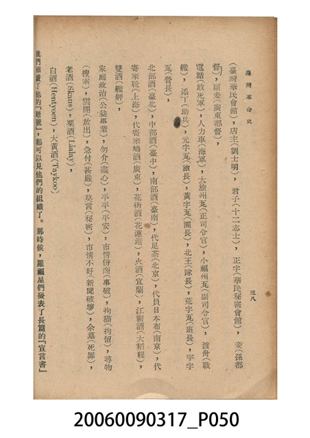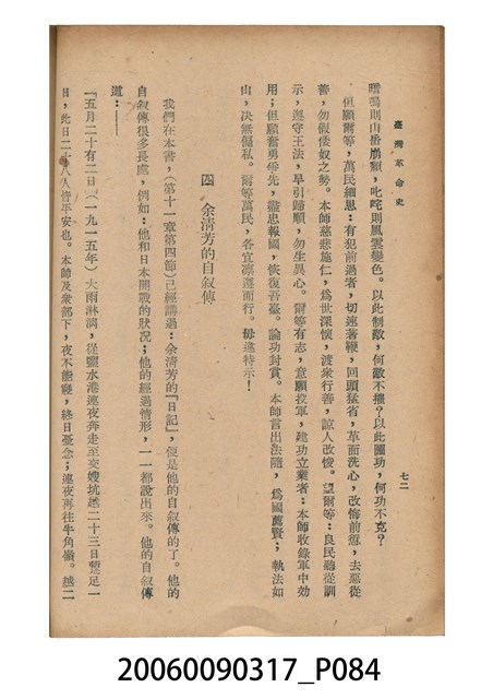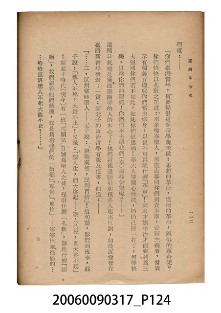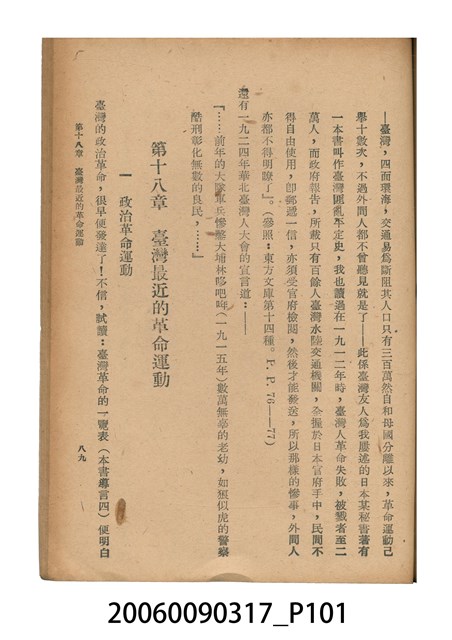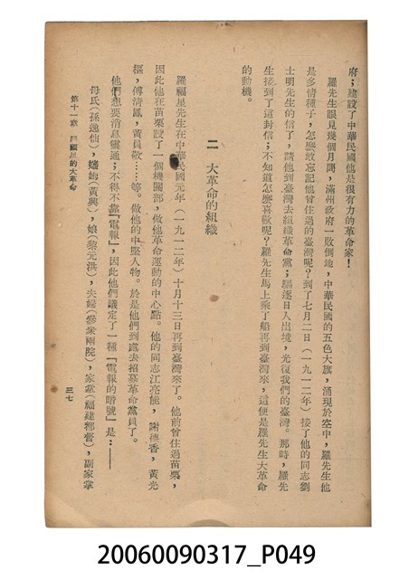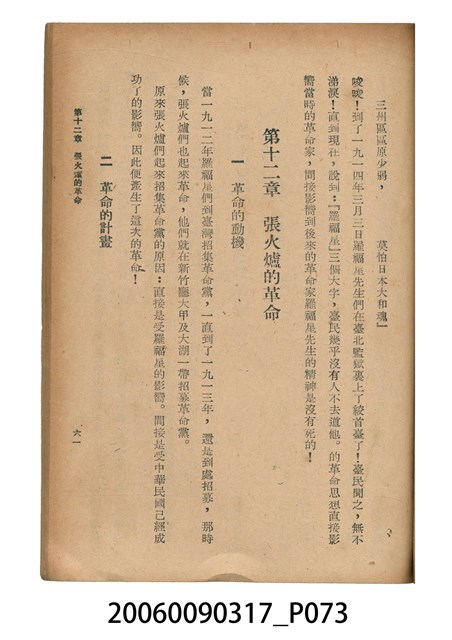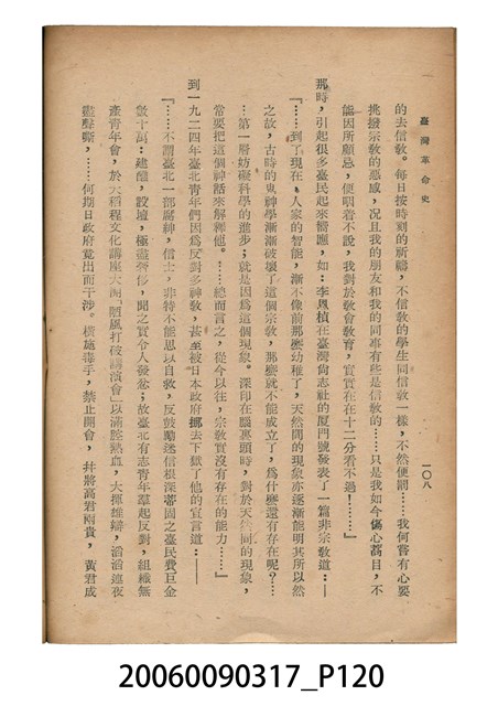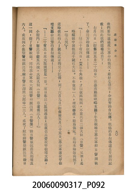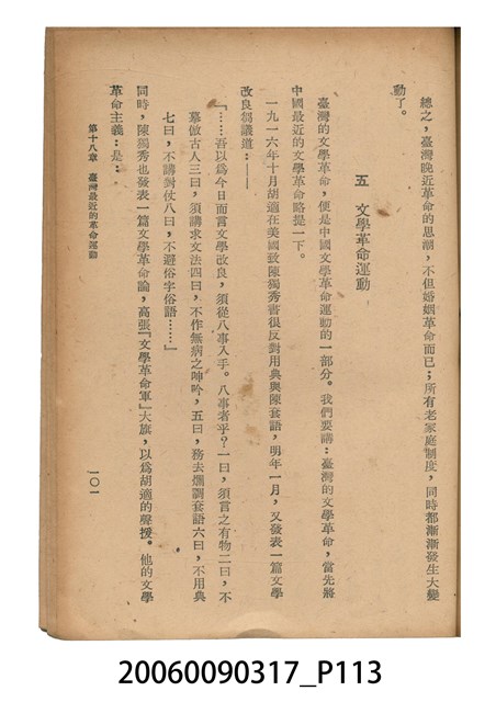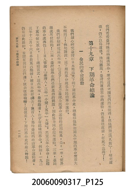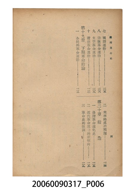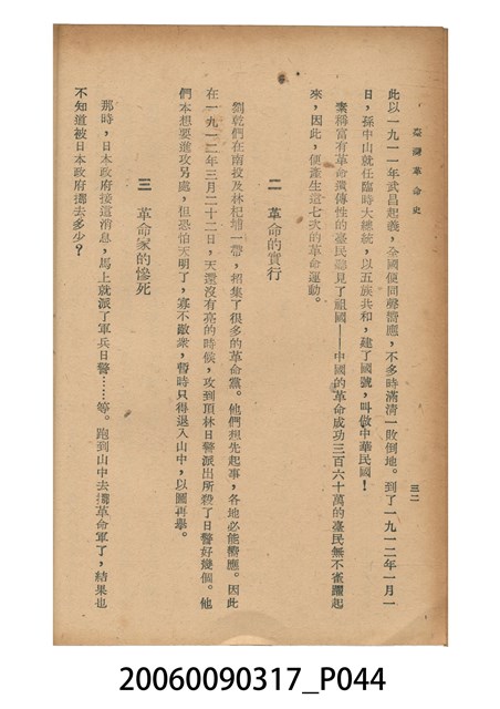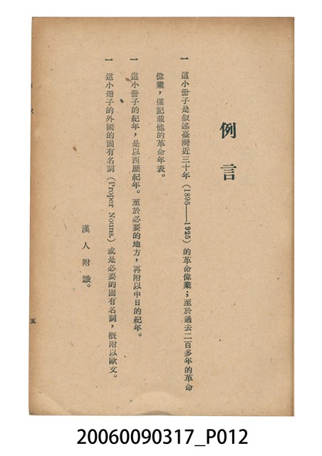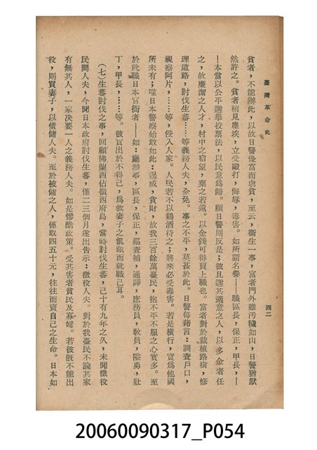 此為一紙質書籍,為一講述日治時期臺灣歷史書籍,名為《臺灣革命史》 本書為筆名漢人的黃玉齋於1925年創作的《臺灣革命史》,黃玉齋完成此書時為廈門大學學生,為了避嫌依此化名為「漢人」,黃玉齋曾自述撰寫此書時為躲避日本追查,只得在放假回臺灣時,前往臺灣總督府臺北圖書館抄譯日人記載的臺灣抗日史料,且為害怕帶入家中,因此每抄寫完便將抄本直接寄送廈門的友人,以利日後撰寫。作者黃玉齋致力於臺灣史的撰寫,對臺灣明鄭時期至日治時期的研究有著重大貢獻,曾擔任臺灣省通志館的編輯委員。 在1895年的甲午戰爭之後,清朝朝廷依「馬關條約」將臺灣割讓給日本,於是日本在當年6月便派出軍隊接收臺灣,臺灣島上的清朝遺民於是展開對日本統治的抵抗,以唐景崧與劉永福為首的臺灣仕紳成立臺灣民主國,但最終兵敗,兩者也逃回中國。後臺灣便持續展開對日本的武裝抵抗,日本方面最初以強硬的武力手段應對反抗勢力,但其後便以經濟與政治手段來攏絡控制民間、招安反抗軍的方式逐步掌握臺灣,以抹平反抗勢力,最終在1915年的「西來庵事件」過後,臺灣除了1930年的霧社事件之外,便再也沒有武裝抗日活動。於是臺灣民間轉而以社會運動的方式爭取權力,臺灣的仕紳展開各種活動,其中「六三法撤廢運動」、「臺灣議會設置請願運動」、「臺灣文化協會」及「《臺灣民報》的發刊」最有影響力。