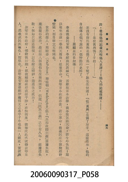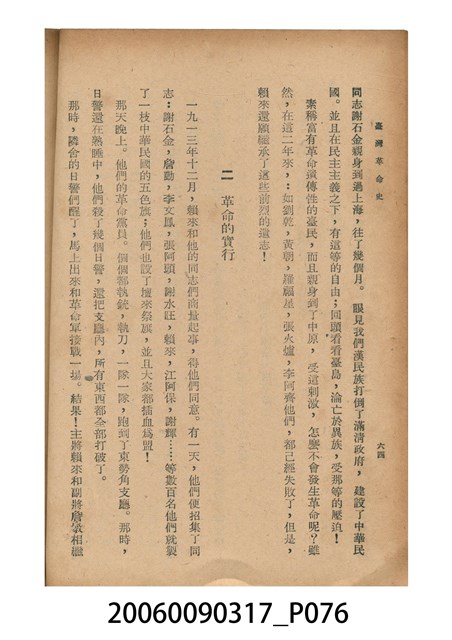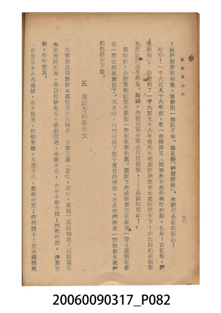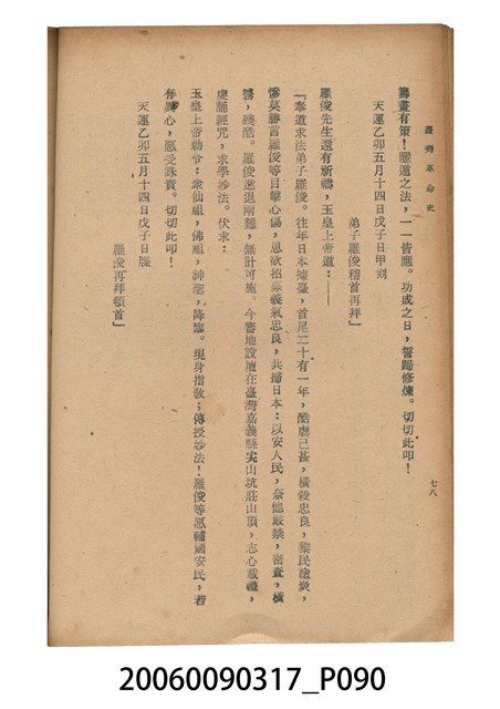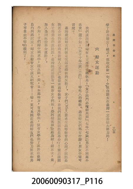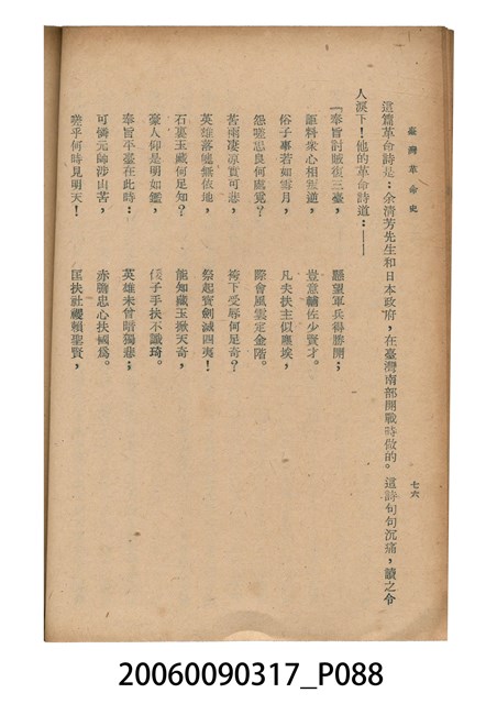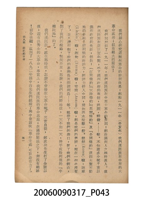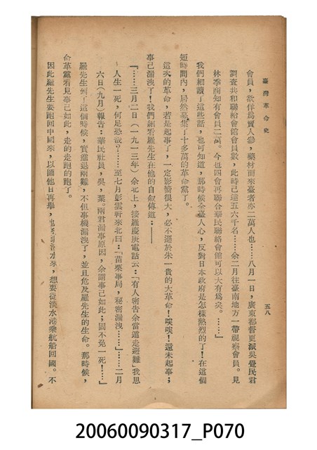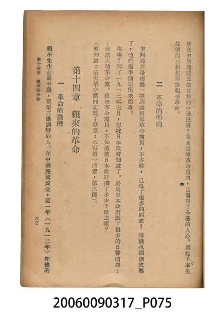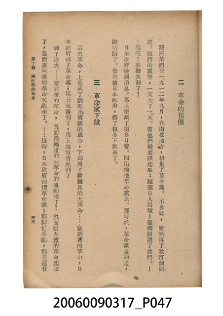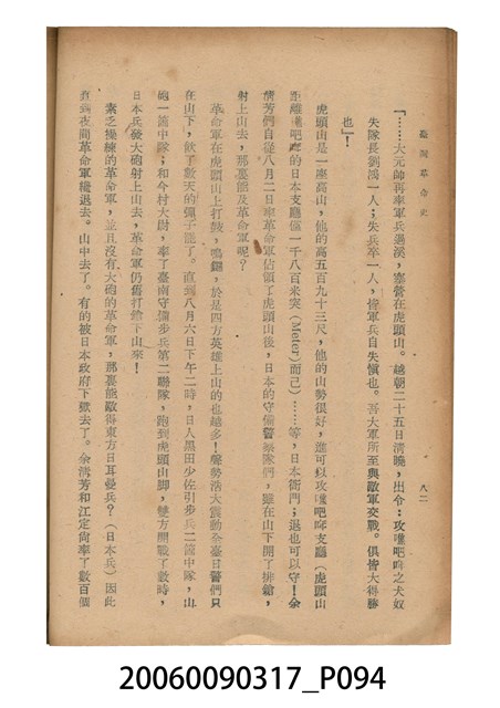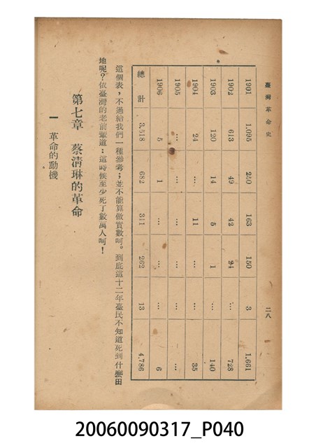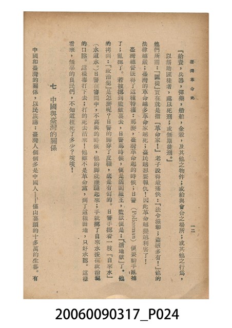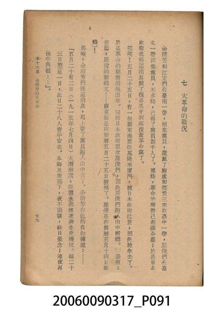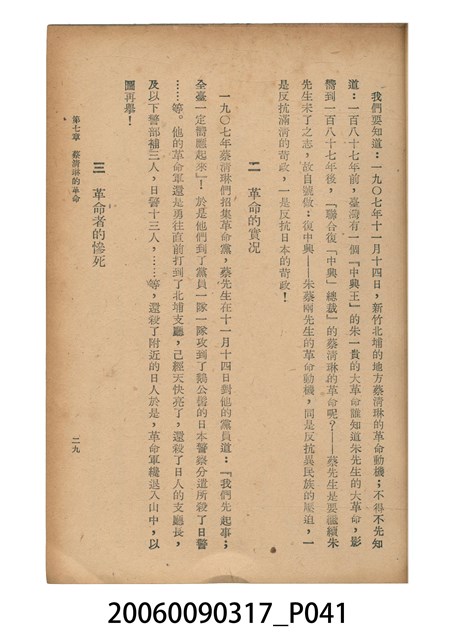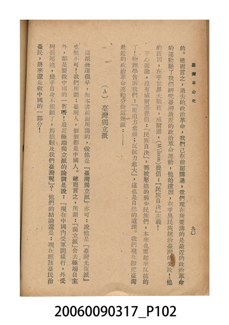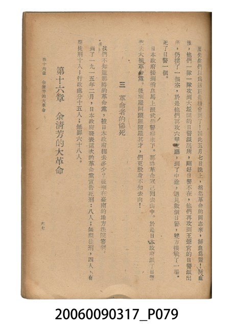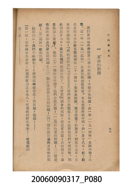 此為一紙質書籍,為一講述日治時期臺灣歷史書籍,名為《臺灣革命史》 本書為筆名漢人的黃玉齋於1925年創作的《臺灣革命史》,黃玉齋完成此書時為廈門大學學生,為了避嫌依此化名為「漢人」,黃玉齋曾自述撰寫此書時為躲避日本追查,只得在放假回臺灣時,前往臺灣總督府臺北圖書館抄譯日人記載的臺灣抗日史料,且為害怕帶入家中,因此每抄寫完便將抄本直接寄送廈門的友人,以利日後撰寫。作者黃玉齋致力於臺灣史的撰寫,對臺灣明鄭時期至日治時期的研究有著重大貢獻,曾擔任臺灣省通志館的編輯委員。 在1895年的甲午戰爭之後,清朝朝廷依「馬關條約」將臺灣割讓給日本,於是日本在當年6月便派出軍隊接收臺灣,臺灣島上的清朝遺民於是展開對日本統治的抵抗,以唐景崧與劉永福為首的臺灣仕紳成立臺灣民主國,但最終兵敗,兩者也逃回中國。後臺灣便持續展開對日本的武裝抵抗,日本方面最初以強硬的武力手段應對反抗勢力,但其後便以經濟與政治手段來攏絡控制民間、招安反抗軍的方式逐步掌握臺灣,以抹平反抗勢力,最終在1915年的「西來庵事件」過後,臺灣除了1930年的霧社事件之外,便再也沒有武裝抗日活動。於是臺灣民間轉而以社會運動的方式爭取權力,臺灣的仕紳展開各種活動,其中「六三法撤廢運動」、「臺灣議會設置請願運動」、「臺灣文化協會」及「《臺灣民報》的發刊」最有影響力。