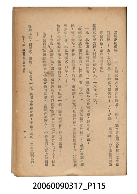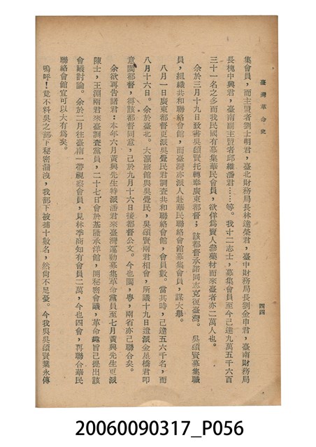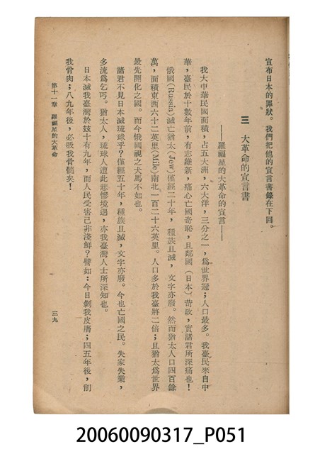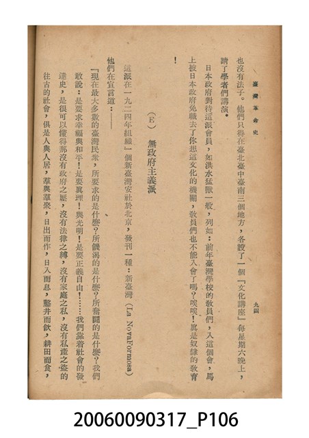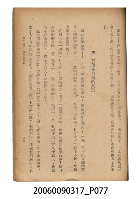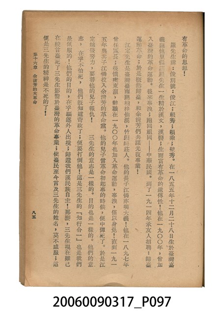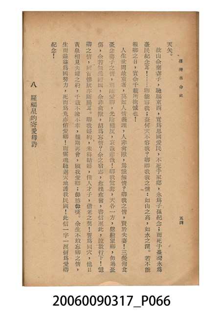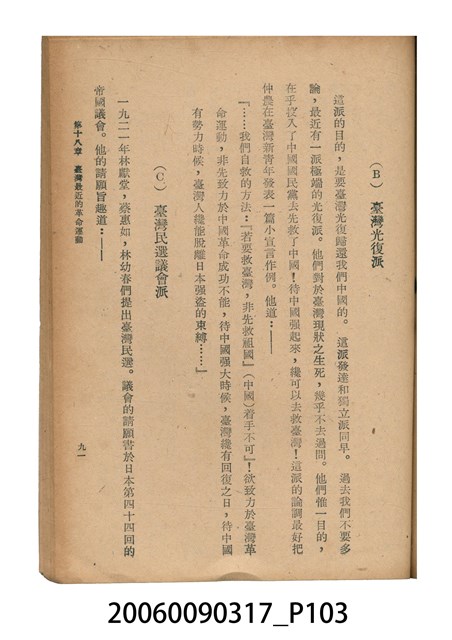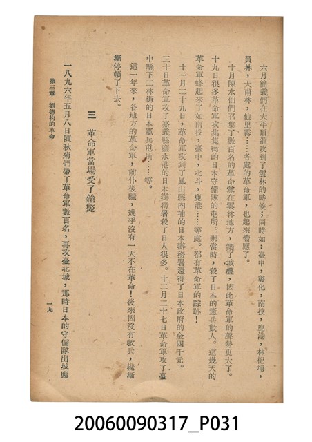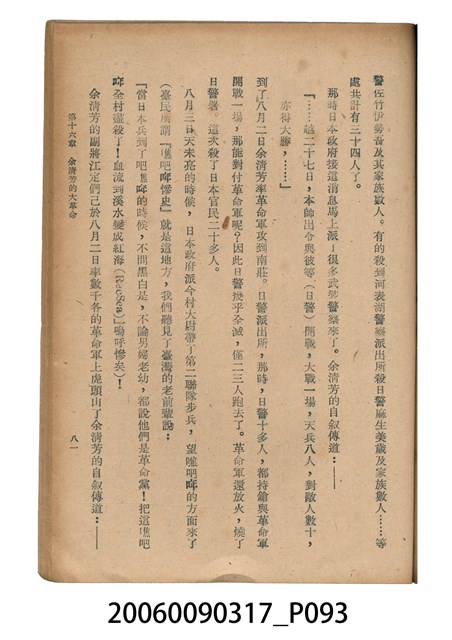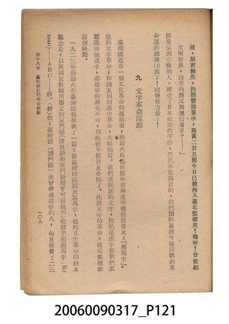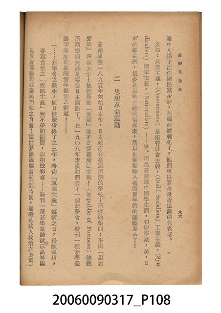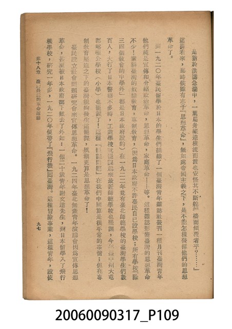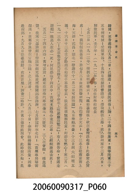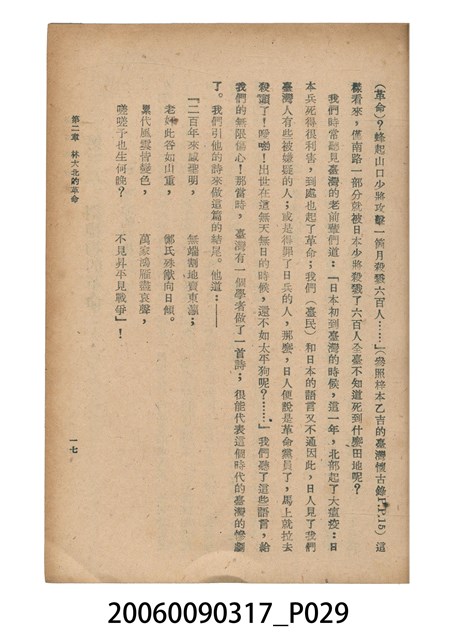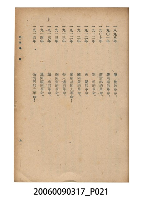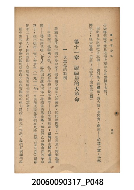 此為一紙質書籍,為一講述日治時期臺灣歷史書籍,名為《臺灣革命史》 本書為筆名漢人的黃玉齋於1925年創作的《臺灣革命史》,黃玉齋完成此書時為廈門大學學生,為了避嫌依此化名為「漢人」,黃玉齋曾自述撰寫此書時為躲避日本追查,只得在放假回臺灣時,前往臺灣總督府臺北圖書館抄譯日人記載的臺灣抗日史料,且為害怕帶入家中,因此每抄寫完便將抄本直接寄送廈門的友人,以利日後撰寫。作者黃玉齋致力於臺灣史的撰寫,對臺灣明鄭時期至日治時期的研究有著重大貢獻,曾擔任臺灣省通志館的編輯委員。 在1895年的甲午戰爭之後,清朝朝廷依「馬關條約」將臺灣割讓給日本,於是日本在當年6月便派出軍隊接收臺灣,臺灣島上的清朝遺民於是展開對日本統治的抵抗,以唐景崧與劉永福為首的臺灣仕紳成立臺灣民主國,但最終兵敗,兩者也逃回中國。後臺灣便持續展開對日本的武裝抵抗,日本方面最初以強硬的武力手段應對反抗勢力,但其後便以經濟與政治手段來攏絡控制民間、招安反抗軍的方式逐步掌握臺灣,以抹平反抗勢力,最終在1915年的「西來庵事件」過後,臺灣除了1930年的霧社事件之外,便再也沒有武裝抗日活動。於是臺灣民間轉而以社會運動的方式爭取權力,臺灣的仕紳展開各種活動,其中「六三法撤廢運動」、「臺灣議會設置請願運動」、「臺灣文化協會」及「《臺灣民報》的發刊」最有影響力。