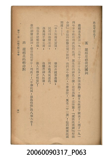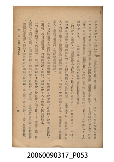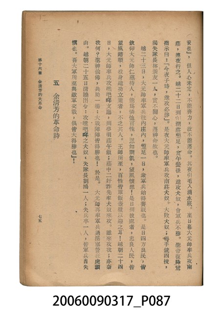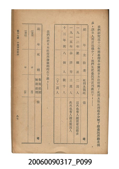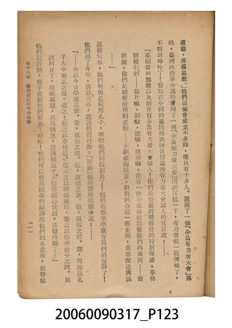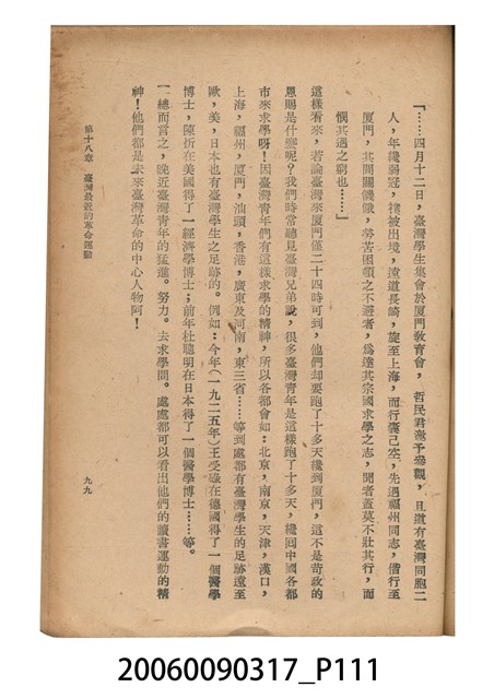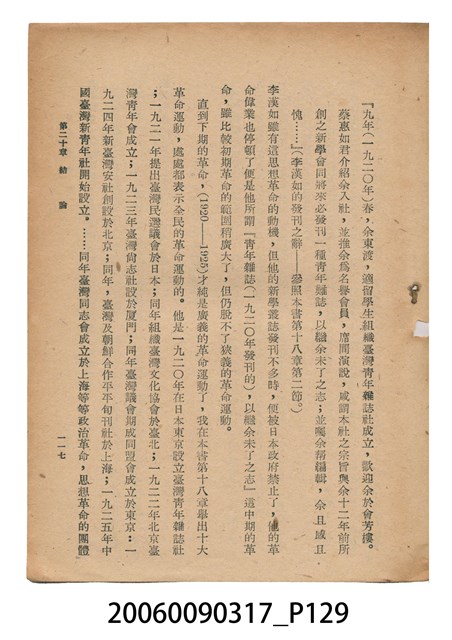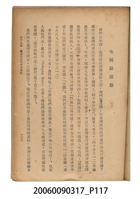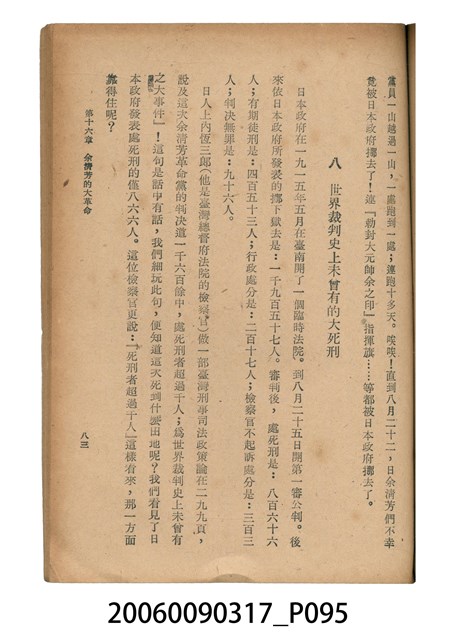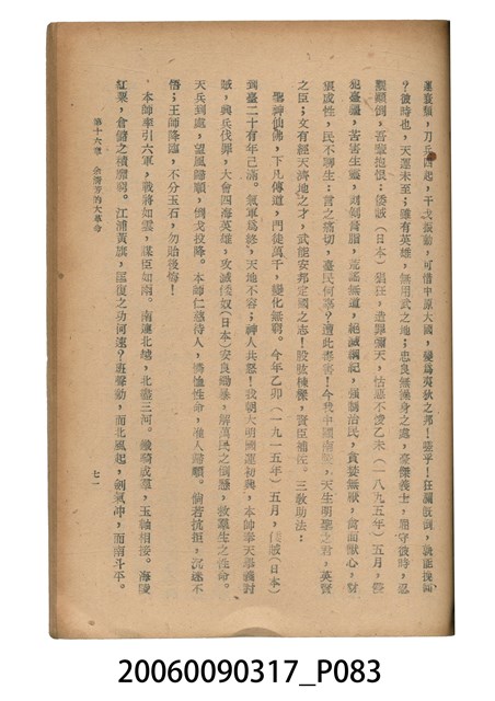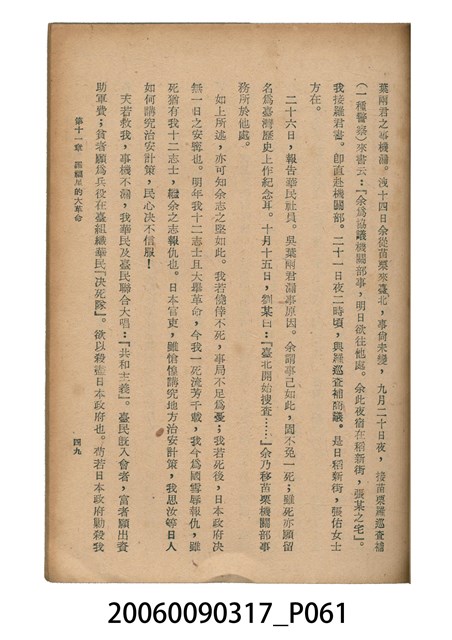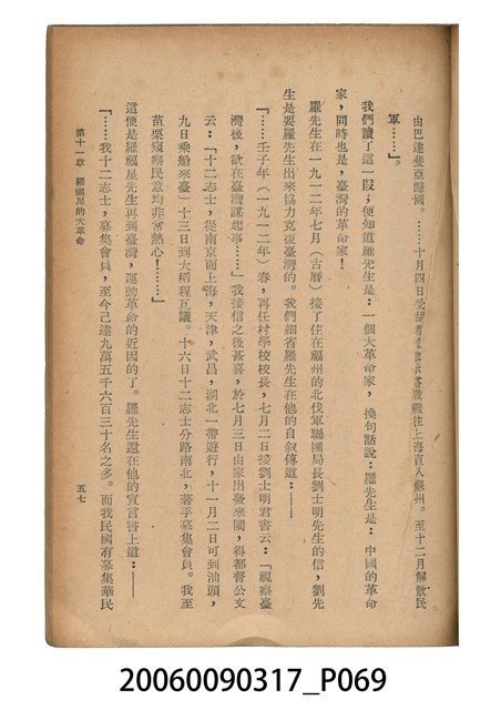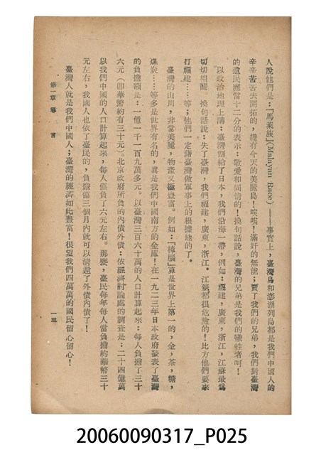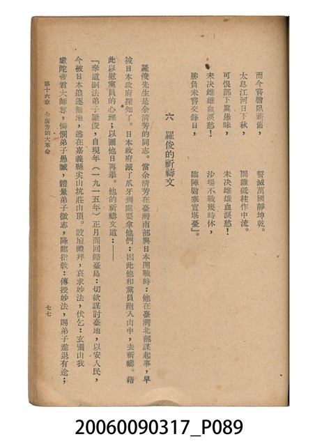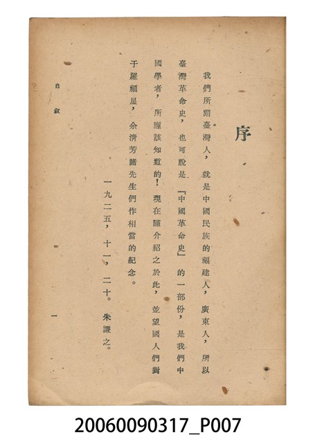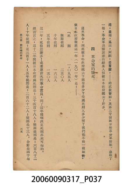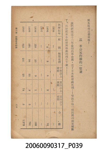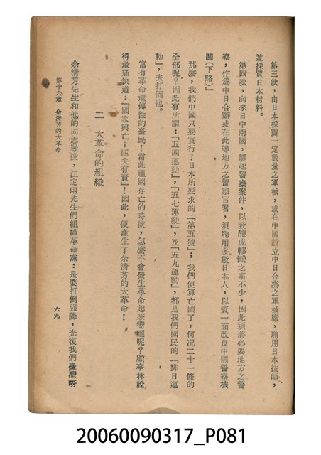 此為一紙質書籍,為一講述日治時期臺灣歷史書籍,名為《臺灣革命史》 本書為筆名漢人的黃玉齋於1925年創作的《臺灣革命史》,黃玉齋完成此書時為廈門大學學生,為了避嫌依此化名為「漢人」,黃玉齋曾自述撰寫此書時為躲避日本追查,只得在放假回臺灣時,前往臺灣總督府臺北圖書館抄譯日人記載的臺灣抗日史料,且為害怕帶入家中,因此每抄寫完便將抄本直接寄送廈門的友人,以利日後撰寫。作者黃玉齋致力於臺灣史的撰寫,對臺灣明鄭時期至日治時期的研究有著重大貢獻,曾擔任臺灣省通志館的編輯委員。 在1895年的甲午戰爭之後,清朝朝廷依「馬關條約」將臺灣割讓給日本,於是日本在當年6月便派出軍隊接收臺灣,臺灣島上的清朝遺民於是展開對日本統治的抵抗,以唐景崧與劉永福為首的臺灣仕紳成立臺灣民主國,但最終兵敗,兩者也逃回中國。後臺灣便持續展開對日本的武裝抵抗,日本方面最初以強硬的武力手段應對反抗勢力,但其後便以經濟與政治手段來攏絡控制民間、招安反抗軍的方式逐步掌握臺灣,以抹平反抗勢力,最終在1915年的「西來庵事件」過後,臺灣除了1930年的霧社事件之外,便再也沒有武裝抗日活動。於是臺灣民間轉而以社會運動的方式爭取權力,臺灣的仕紳展開各種活動,其中「六三法撤廢運動」、「臺灣議會設置請願運動」、「臺灣文化協會」及「《臺灣民報》的發刊」最有影響力。