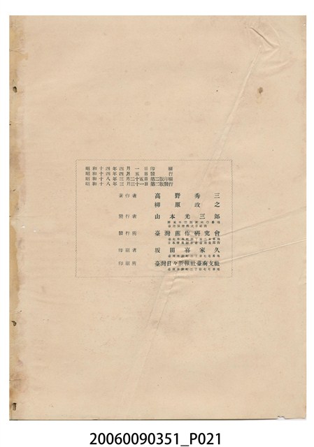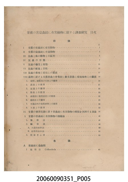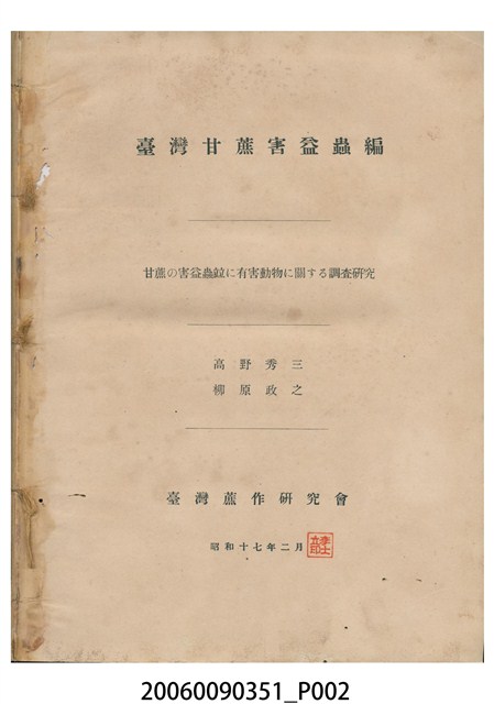 本物件為臺灣蔗作研究會發行《臺灣甘蔗害益蟲編:甘蔗の害益蟲竝に有害動物に關すゐ調查研究》第二版,作者為高野秀三和柳原政之。內容為與甘蔗相關的害蟲益蟲與動物特性等,包括有害昆蟲及益蟲的基本介紹、形態、發生的變態、經過的習性、發生狀態與環境條件的關係、種類與判別方法、防除法,以及各種昆蟲及動物的細部介紹等。