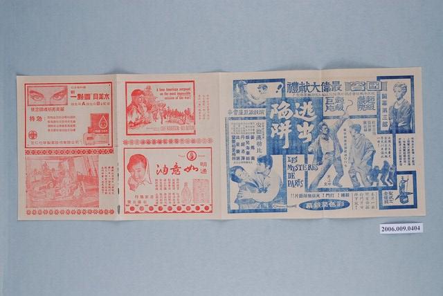 本件保存良好,為國賓戲院出品,逃出陷阱 Les mystères de Paris電影廣告單。電影由姜馬萊 Jean Marais、姬兒海華絲 Jill Haworth、丹妮洛萍 Dany Robin、比里蒙第Pierre Mondy、雷蒙柏里格林 Raymond Pellegrin主演,導演為安德翰勒比 André Hunebelle。電影單其他部分為電影續最長的一日、海賊大將、三虎屠龍。
