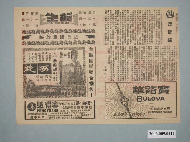 本件保存良好,為新生戲院出品,海上長城 In Harm's Way電影廣告單。電影由約翰韋恩 John Wayne、寇克道格拉斯 Kirk Douglas、亨利方達Henry Fonda、柏楚茜妮兒 Patricia Neal、湯姆泰龍 Tom Tryon、寶拉普倫蒂絲 Paula Prentiss、布蘭登狄威德 Brandon De Wilde 、曉奧勃連主演,導演為奧圖柏明傑 Otto Preminger。電影單其他部分為電影西施、反間諜電影本事。