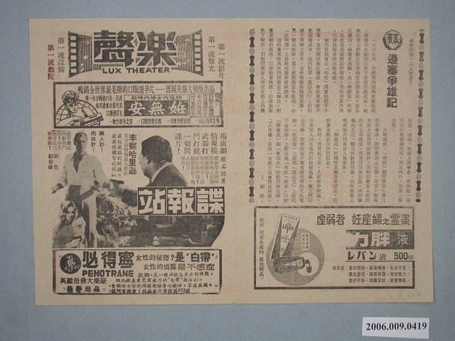 本件保存良好,為樂聲戲院出品,瘋狂大賽車 The Great Race廣告單。電影由湯尼寇蒂斯 Tony Curtis、娜妲麗華 Natalie Wood、傑克李蒙 Jack Lemmon主演,導演為Blake Edwards。電影單其他部分為電影諜報站、邊塞爭雄記電影本事。