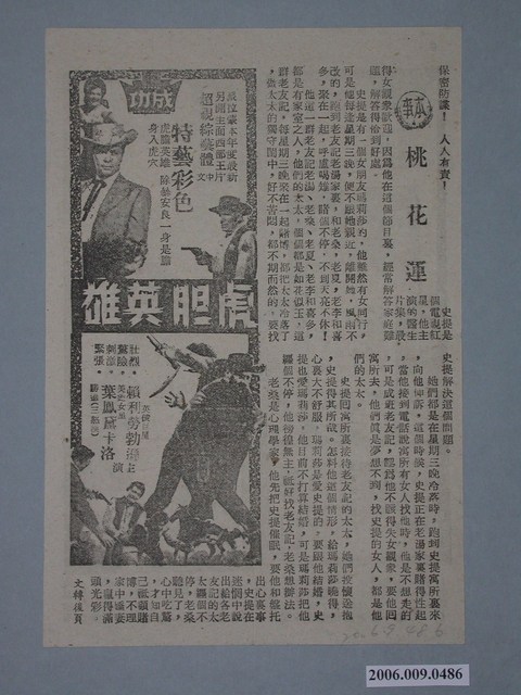 本件保存良好,為成功戲院出品,銀湖寶藏 Der Schatz im Silbersee電影廣告單。電影由力士柏克 Lex Barker、赫伯朗 Herbert Lom、嘉蓮荳亞 Karin Dor主演,導演為 Harald Reinl。電影單其他部分為電影紐曼軍醫、虎膽英雄、桃花運電影本事。