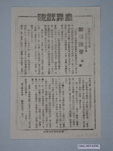 電影廣告單《戰爭與和平》直幅單張雙面黑色印刷,外觀保存良好。本事頁是慶昇戲院「斷腸弦聲」的故事。一面是《戰爭與和平》電影宣傳海報,下方有「保密防諜,人人有責」字樣。《戰爭與和平》講述拿破崙(Herbert Lom)與俄羅斯的動盪關係,包括他1812年的災難性入侵,是兩個貴族家庭糾纏不清的個人生活的背景的故事。電影由奧黛麗赫本( Audrey Hepburn)、亨利方達 (Henry Fonda)主演,導演維多爾金。