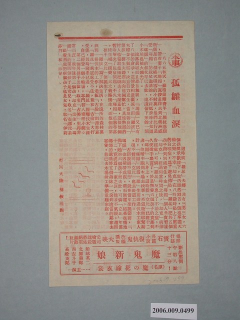 電影本事《黑獄亡命記》為直幅單張紅色雙面印刷,外觀保存良好。電影由 Jack Palance、Harold J. Stone、Edward Platt 主演,導演Russell Rouse,1957年上映。下方為《殺手神鎗》電影宣傳。左下有「國家至上 民族至上」字樣。背面為《孤雛血淚》All Mine to Give電影本事,電影由 Glynis Johns、Cameron Mitchell、Rex Thompson主演,導演Allen Reisner,1957年上映。下方為《魔鬼新娘》原名:魔の花嫁