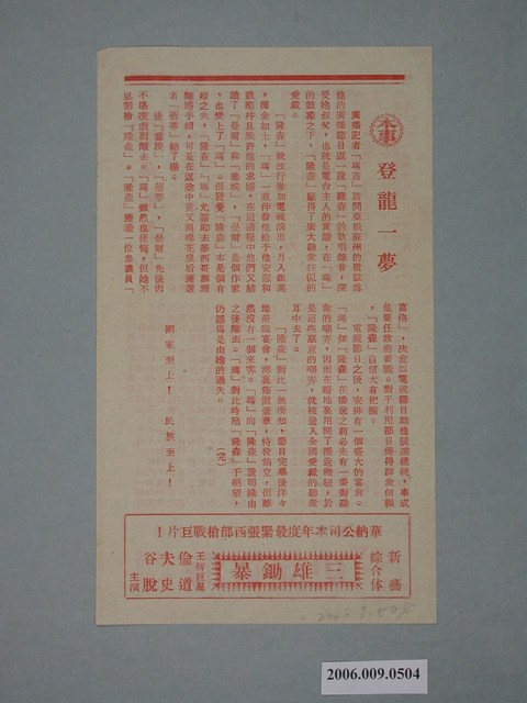 電影本事《萬能警官》為直幅單張紅色雙面印刷,外觀保存良好。電影資訊不詳。下方為《海盜艷史》Frenchman's Creek電影宣傳,又名:貴婦與海盜、法國人的港灣,電影由瓊芳登Joan Fontaine、 阿圖羅·德·科爾多瓦Arturo de Córdova、巴茲爾·拉思伯恩Basil Rathbone 主演,1944年上映。派拉蒙公司出品。背面為電影本事《登龍一夢》A Face in the Crowd。電影由 Andy Griffith、Patricia Neal、Anthony Franci