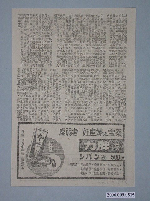 電影本事《西部開拓史》為直幅單張黑色雙面印刷,外觀保存良好。又名:平西志。電影由詹姆史都華James Stewart、約翰韋恩John Wayne主演,導演 約翰福特John Ford、亨利哈撒韋Henry Hathaway,1962年上映。上方為胃藥「利胃達片Libratar Complex」廣告。下方為血壓藥「安血樂片」廣告。右側有「保密防諜 人人有責」字樣。背面為電影本事《西部開拓史》續寫,下方為保健食品「カ胖液」廣告。
