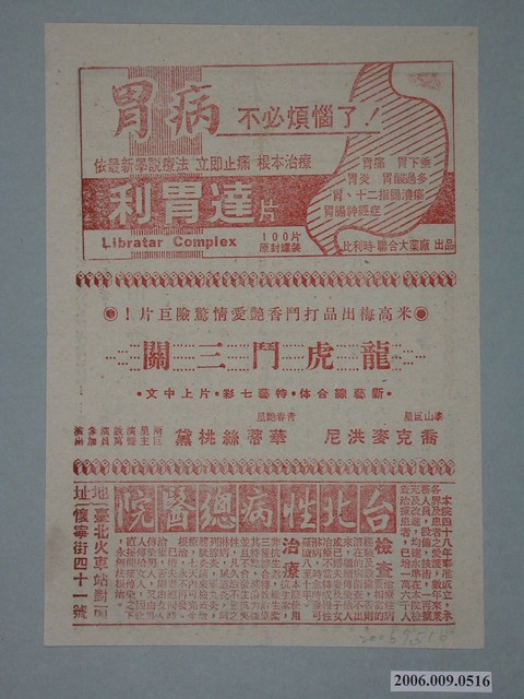 電影本事《阿拉伯的勞倫斯》為直幅單張雙面印刷,本事頁為黑色印刷,外觀保存良好。又名:沙漠梟雄、阿拉伯的羅倫斯。電影由 彼得奧圖Peter O'Toole、亞歷堅尼斯Alec Guinness、安東尼昆Anthony Quinn 主演,導演 大衛里恩David Lean,1962年上映。上方為血壓藥「安血樂片」廣告。右側有「保密防諜 人人有責」字樣。背面為紅色印刷,電影《龍虎鬥三關》宣傳,由喬克麥洪尼、華蒂絲桃黛主演,米高梅出品。上方為胃藥「利胃達片Libratar Complex」廣告。下方為「台北性