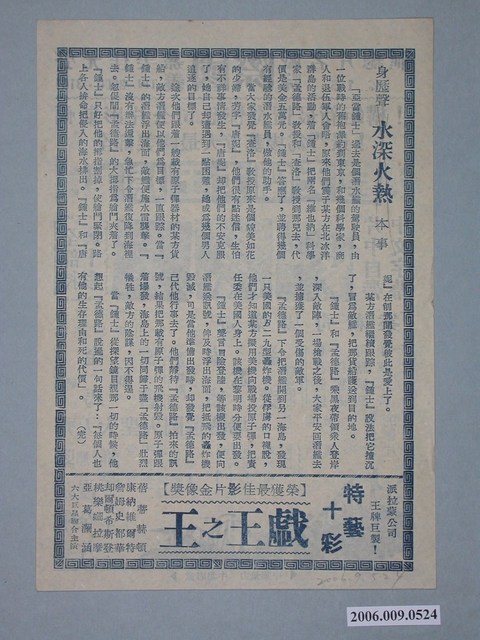本件保存良好,為國際戲院出品,美猴王大鬧天宮電影廣告單。電影由金馬倫密曹、安賓歌羅芙主演。電影單其他部分為電影戲王之王、水深火熱電影本事。