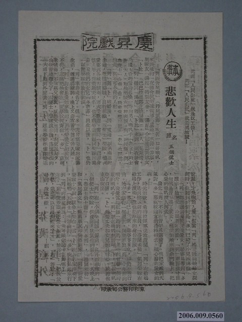 電影廣告單《蛮山野俠》直幅單張雙面黑色印刷,外觀保存良好。本事頁是慶昇戲院「悲歡人生」的故事。一面是《蛮山野俠》電影宣傳海報。《蛮山野俠》講述一名男子拯救了一名被Comanches綁架的女子,然後努力讓兩人都活著的故事。電影由Randolph Scott、 Nancy Gates主演,導演Budd Boetticher。