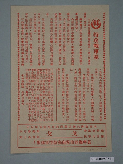 本件保存良好,黑白雙面印刷,為曠夫情婦電影本事,其他部分為特工戰車隊電影本事、電影琴瑟怨、戈戈宣傳。