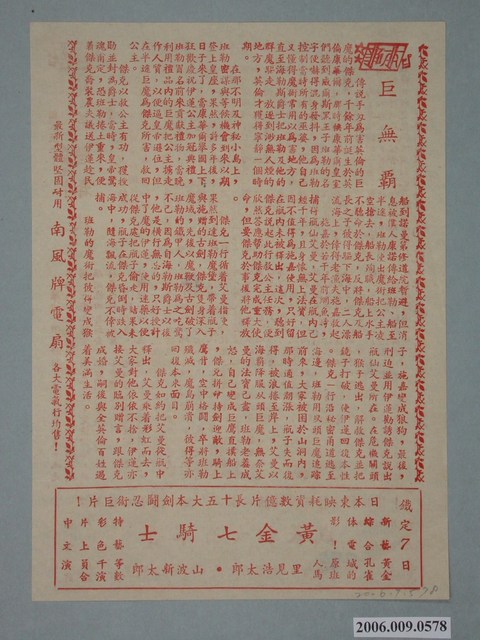 本件保存良好,黑白雙面印刷,為花蕊戀春風電影本事,由蘇珊妮普雪特、脫埃唐納荷、羅仙諾布拉西主演。其他部分為巨無霸電影本事、電影吾家有女初長成、黃金七騎士宣傳。