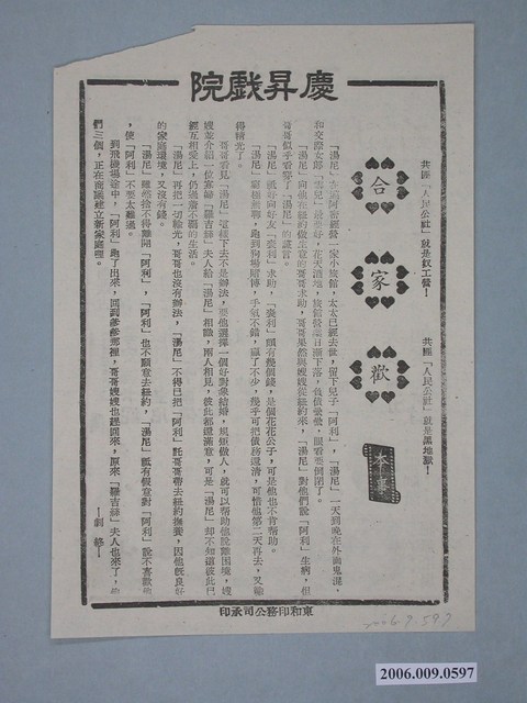 本件保存尚可,為慶昇戲院出品,武士妖后電影廣告單。電影由琴安娜卡妮、伊陀利曼尼、拉斐卡爾佛主演。電影單其他部分為電影合家歡電影本事。