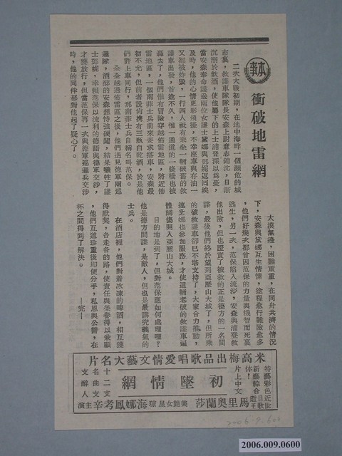 本件保存良好,黑白雙面印刷,為憤怒的山谷The Angry Hills電影本事,由Robert Mitchum、Elisabeth Mueller主演,導演為Robert Aldrich。其他部分為衝破地雷網電影本事、電影父親離家時、初墜情網宣傳。