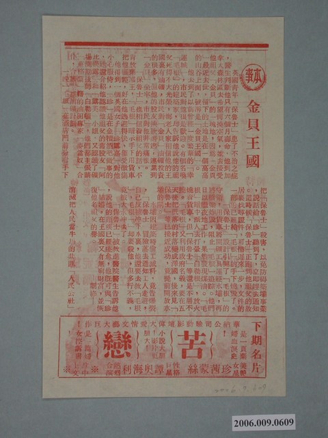 本件保存良好,為孤星淚 Les misérables電影廣告單。電影由約翰傑潘 Jean Gabin、黛妮桃樂姆 Danièle Delorme、貝爾納布立 Bernard Blier主演,導演為 Jean-Paul Le Chanois。電影單其他部分為電影風雨友情、苦戀、金貝王國電影本事。