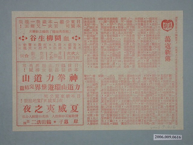 本件保存良好,紅色雙面印刷,為國際戲院出品荒島仙窟日月情電影本事,其他部分為蕩寇新傳電影本事、電影悲戀之花、血鬥柳生谷、神拳力道山、夏威夷之夜宣傳。