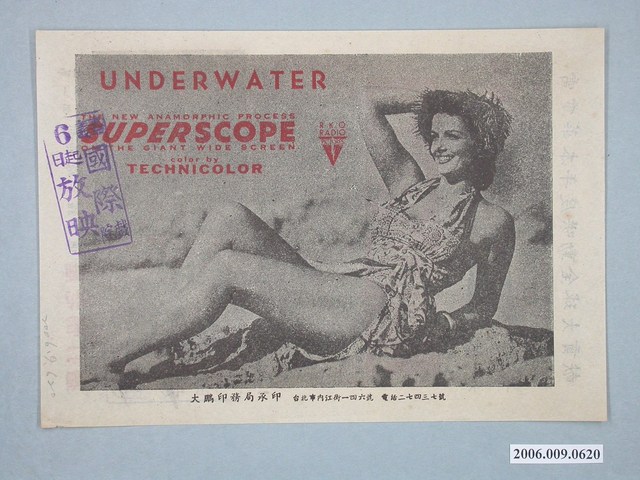 本件保存良好,為嘉義國際戲院出品,海宮仙蕊Underwater!電影廣告單。電影由珍羅素Jane Russell主演,導演為 John Sturges。電影單其他部分為電影芳鄰良緣、血肉長城、西部浪子電影本事