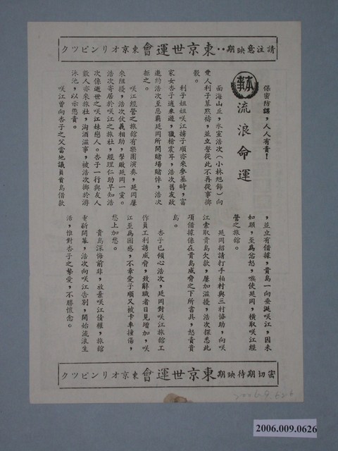電影廣告單《萬世千秋》直幅單張雙面黑色印刷,外觀保存良好。本事頁是慶昇戲院「流浪命運」的故事,右上方有「保密防諜,人人有責」字樣。一面是《萬世千秋》電影宣傳海報。《萬世千秋》講述在教皇朱利葉斯二世的催促下,米開朗基羅在繪製西斯廷教堂時遇到麻煩的傳記故事。電影由雷克斯哈里遜(Rex Harrison)、却爾登赫斯頓(Charlton Heston)主演,導演卡羅爾·里德,國際經典出品。