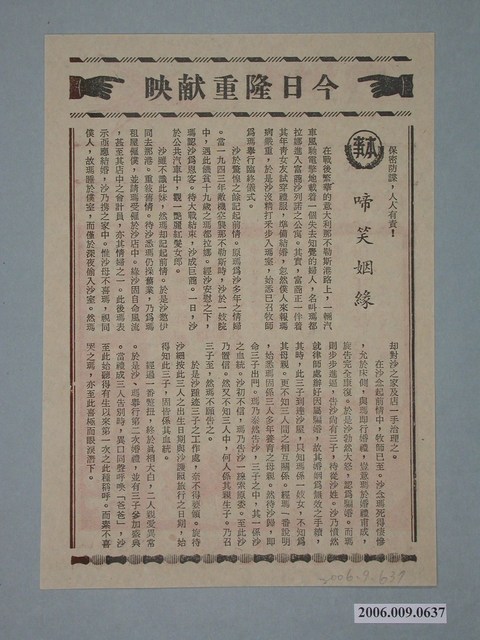 本件保存良好,為大世界戲院出品,金鎗大鏢客 Johnny Oro電影廣告單。電影由馬克達蒙Mark Damon主演,導演為Sergio Corbucci。電影單其他部分為電影啼笑姻緣電影本事。