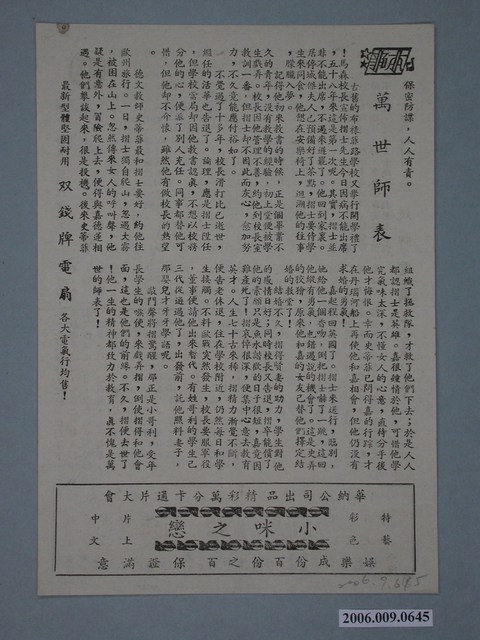 本件保存良好,黑白雙面印刷,為四海一家電影本事,其他部分為萬事師表電影本事、電影追男記、小咪之戀宣傳。