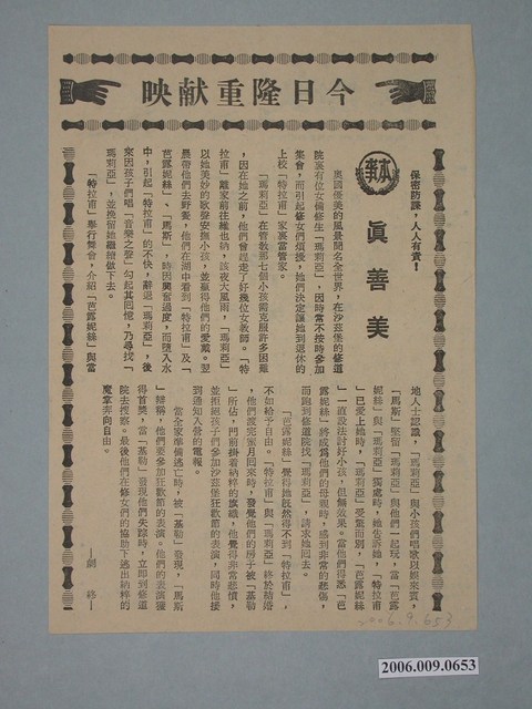 本件保存良好,為大世界戲院出品,真善美 音樂之聲 The Sound of Music電影廣告單。電影由茱莉安德魯絲 Julie Andrews主演,導演為勞勃懷斯 Robert Wise。電影單其他部分為電影真善美電影本事