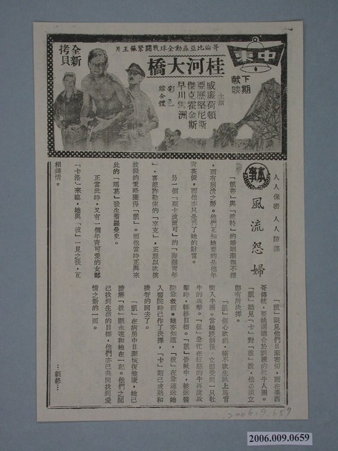本件保存良好,為中東戲院出品,昨日今日明日電影 Ieri oggi domani廣告單。電影由蘇菲亞羅蘭 Sophia Loren、馬斯杜安尼 Marcello Mastroianni主演,導演為狄西嘉 Vittorio De Sica。電影單其他部分為電影桂河大橋、風流怨婦電影本事。