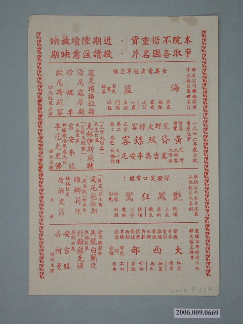 本件保存良好,黑白雙面印刷,為新都大戲院出品冰雪盟電影本事,其他部分為電影海盜、黃昏雙鏢客、艷鳳狂鸞、大西部宣傳。