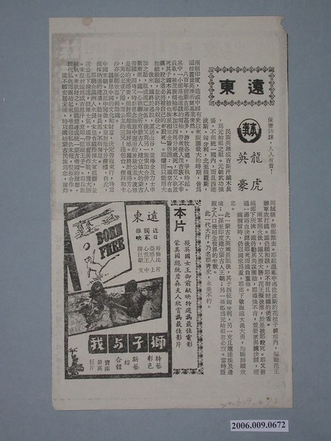 本件保存良好,黑白雙面印刷,為遠東戲院出品龍虎英豪電影本事,其他部分為電影獅子與我、諜海密碼戰、西部浪子、零零七情報員雷光鎗宣傳。