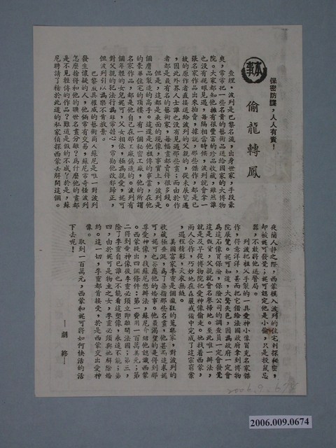 本件保存良好,為慶昇戲院出品,玉諜女蛟龍 Modesty Blaise電影廣告單。電影由泰倫史頓普 Terence Stamp、蒙尼卡薇蒂 Monica Vitti、狄克鮑嘉 Dirk Bogarde、麥克周 Michael Chow主演,導演為 Joseph Losey。電影單其他部分為電影記中記、偷龍轉鳳電影本事。