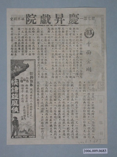 本件保存良好,為慶昇戲院出品,大遊俠 さすらい 電影廣告單。電影由小林旭、松原智惠子主演,導演為野口博志。電影單其他部分為電影西部大鎗手、快鎗旋風俠、千面金剛電影本事。
