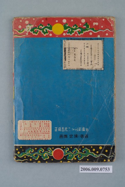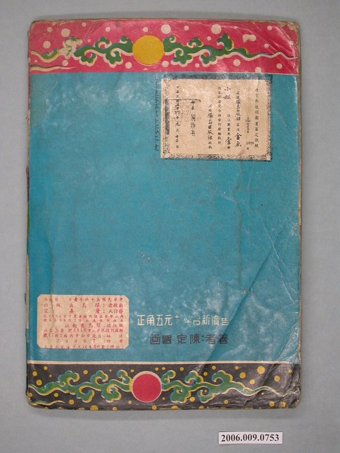 1.本件漫畫《金魚小姐 》的封面為2隻彩色的金魚,旁有水草,上面橫書「有趣有益的兒童讀物」、「童話故事漫画集」、「金魚小姐」、「陳定國畫」、「全」等字,背面右上方為教育部連環圖畫審定執照,左下方為版權說明,外觀老舊,周邊有皺摺,保存完整。2.陳定國(1923-1999)是臺灣的漫畫家,出生於新竹縣新埔鎮,洪德麟譽他為「獨創鳳眼美人的少女漫畫家」。