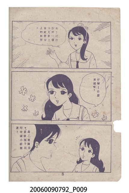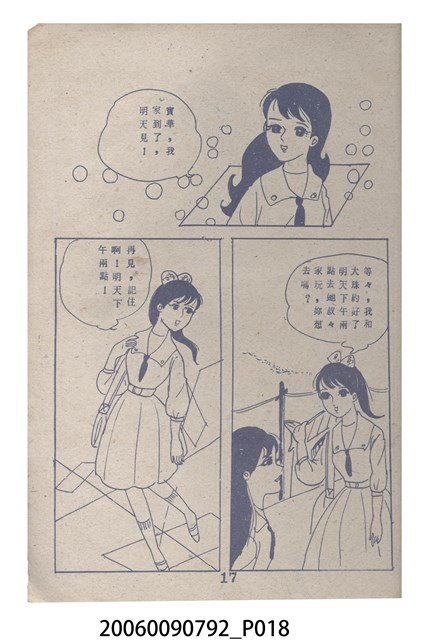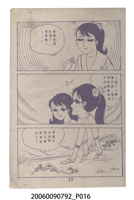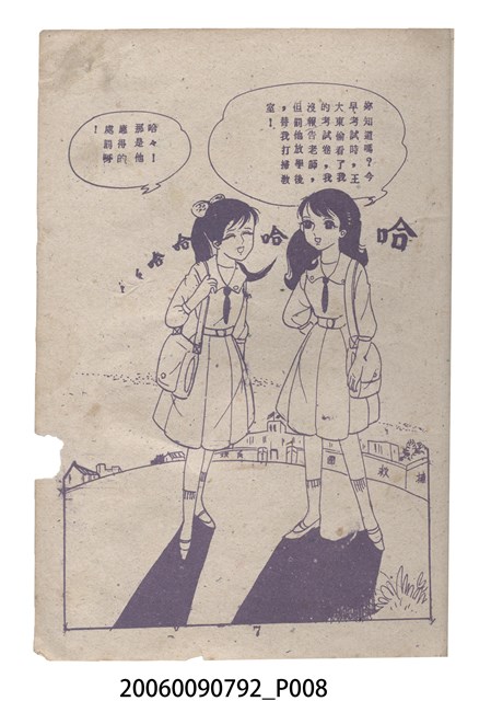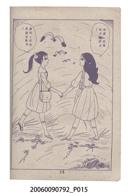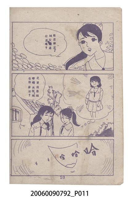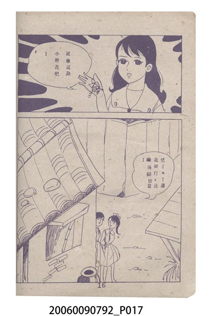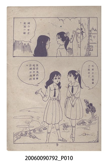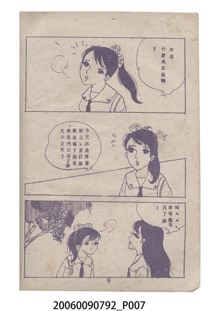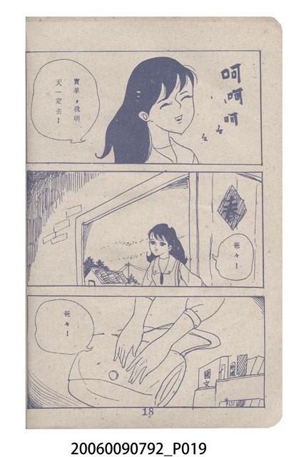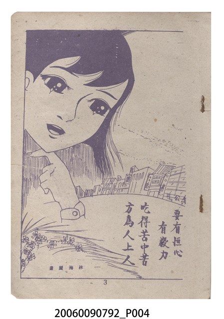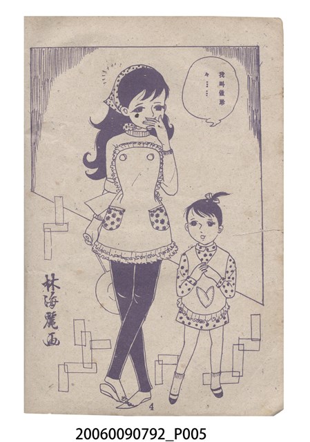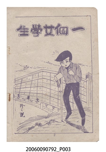 1.本件為永祥出版社《一個女學生》,為一部少女愛情漫畫,內容敘述一位在校女生初嘗愛情滋味,從暗戀、相戀的酸甜苦辣過程。封底有民國55年(1966)11月19日國立編譯館連環圖書畫審定執照的合格圖樣。2.漫畫是以圖像為呈現,具備繪畫、敘事、角色三要素,能因敘事而令圖像帶有個別意義、令作品內容獨立且完整的資訊載體。臺灣漫畫史上,民國55年(1966)實施「編印連環圖畫輔導辦法」嚴重衝擊漫畫創作,至民國76年(1987)解嚴,終止審查制度進入嶄新興盛的局面。