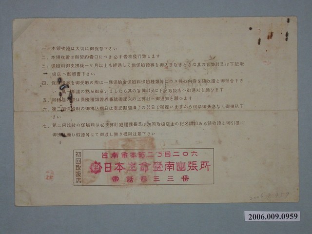 本件為昭和15年(1940)7月5日日本生命保險株式會社給予鄭溪淮之第壹回保險料領收證,鄭溪淮向日本生命保險株式會社保險種類「每年利益配當附參拾年滿期養老生命保險」,保險金額壹千五百圓,本次繳納四拾參圓參拾五錢,此為繳費收據。