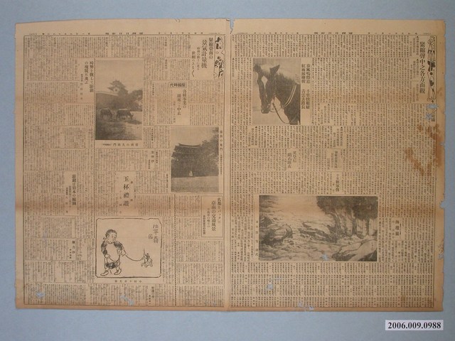 1.本物件為昭和5年1月1日發行之臺灣日日新報其中一版,「緊縮臺南的景氣計量機」此篇文章刊登於中間最上面的位置,旁邊也有相關主題的專欄與臺南東門、大南門附近之照片,背面則印有「謹賀新年」字樣、許多人名與公司行號及臺灣北部及東部新聞報導。