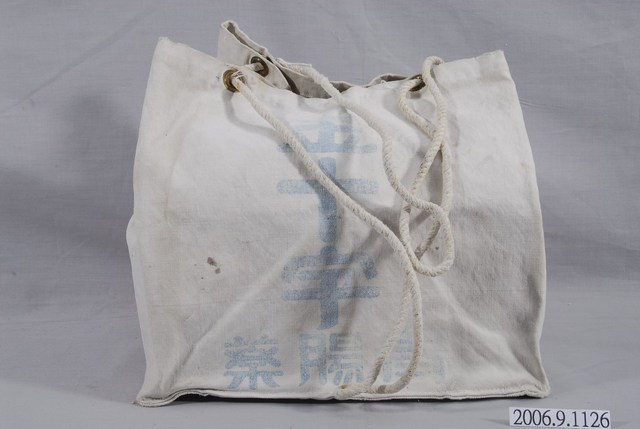 1.本物件為金十字胃腸藥帆布袋。帆布袋為白色,前後兩面印有藍色字體,為金十字胃腸藥。 2.1947年,林添如創辦日榮堂藥房,1953年萬仁藥廠成立,為新萬仁公司之前身,同年推出「金十字胃腸藥」。