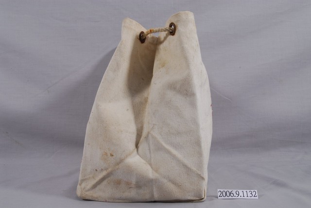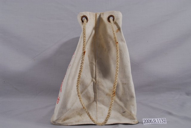 1.本物件為復信糖菓玩具行帆布袋,袋子為米白色,正反兩面以紅色印有復信糖菓玩具行所販售的商品、地址和聯絡方式,袋上方共有四個孔洞並穿過一條白色繩子作為提把。