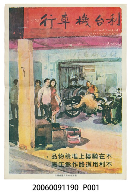 本物件為海報,臺灣省政府交通處編印,主題為不在騎樓上堆積物品,不利用道路作為工廠,海報為彩色印刷,圖案可以看到行人在騎樓行走,騎樓上堆著一些物品。