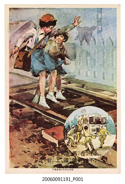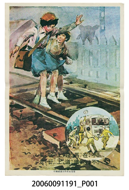 本物件為臺灣省政府交通處宣導海報,中央有兩位女學生正走在鐵道上,右下角圓框內為一群男學生於道路上嬉戲,下方寫有標語「不在馬路上玩耍,不在鐵道上行走」,海報整體保存完整。