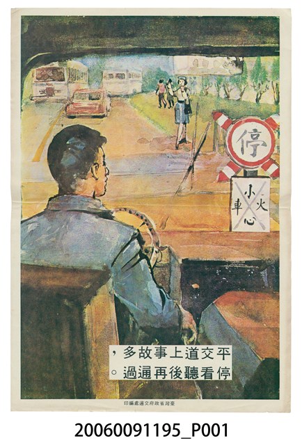 本物件為海報,臺灣省政府交通處編印,主題為平交道上事故多,停看聽後再通過。海報為彩色印刷,圖案可以看到一位駕駛正在等平交道。