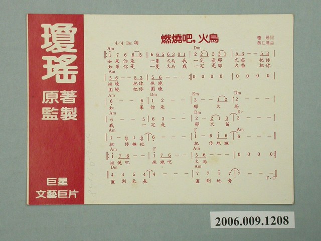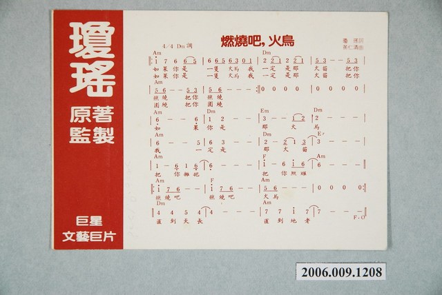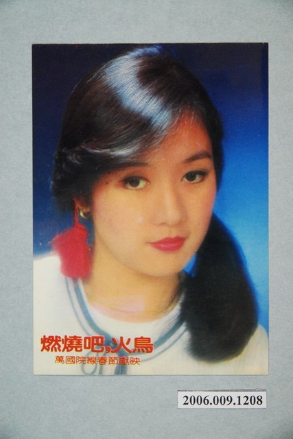 1.臺灣電影《燃燒吧,火鳥》電影宣傳小卡,直式印刷。畫面主要呈現呂㛢菱露出淺淺微笑的胸上特寫,搭配「燃燒吧,火鳥」、「萬國院線春節獻映」字樣,背面印有〈燃燒吧,火鳥〉歌譜。2.造型出自臺灣電影《燃燒吧,火鳥》,1982年由巨星(香港)影業公司出品,劉立立執導,喬野編劇,呂㛢菱、林青霞、劉文正主演的愛情片。