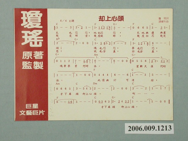 1.臺灣電影《卻上心頭》的彩色宣傳小卡,直式印刷。畫面主要呈現呂㛢菱露出淺淺微笑的胸上特寫,搭配「卻上心頭」、「今日院線春節獻映」字樣。2.造型出自臺灣電影《卻上心頭》,1982年由巨星(香港)影業公司出品,劉立立執導,喬野編劇,劉文正、呂㛢菱、雲中岳、劉藍溪主演的愛情片。