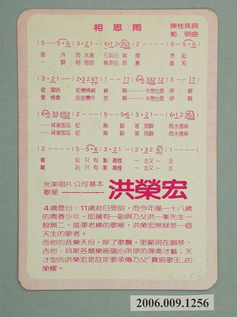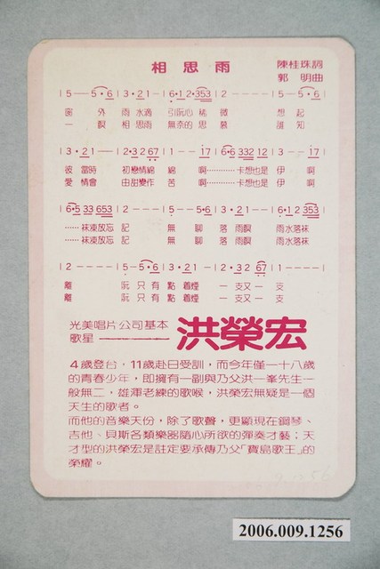 1.臺灣男星洪榮宏的明星照片小卡,直式印刷。畫面主要呈現洪榮宏微笑模樣的半身特寫,搭配「洪榮宏」字樣。背面印有〈 相思雨〉歌譜,和洪榮宏簡介。2.造型出自《歹路不可行》臺語唱片專輯,1981年由光美唱片發行。
