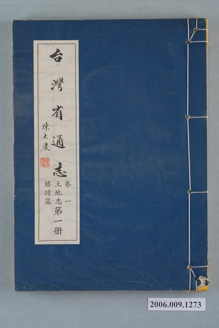 1.本物件為臺灣省文獻委員會出版的《臺灣省通志》卷一土地志勝蹟篇第一冊,採線裝裝訂。封面、封底底圖均為藍色,由目次可知內文有前言,以及臺灣八景、臺北市、臺北縣、陽明山管理局、基隆市、宜蘭縣、桃園縣、新竹縣、苗栗縣、臺中縣、臺中市、南投縣、彰化縣、雲林縣、嘉義縣、臺南縣、臺南市、高雄縣、高雄市、屏東縣、臺東縣、花蓮縣、澎湖縣等23章;而本冊所敘述到的是第1章臺灣八景至第12章南投縣之內容。2.1948年6月,臺灣省通志館成立,由林獻堂任館長,主持臺灣省通志纂修事宜。1949年,臺灣省通志館改為臺灣省文獻委員會(簡稱省文獻會);1951年,內政部核備臺灣省通志稿纂修綱目,開始撰稿。先後在1960年完成大部分的篇章(斷限至戰後初期),以及1967年完成增修(斷限至1961年)。由於1960年的原修稿與1967年的增修稿作者眾多,難以連貫,相互牴觸之處不少,以致難以付梓,1966年,省文獻會成立整理小組,展開通志稿整修計畫,調整原志綱目,制定整修辦法,以省文獻會主任委員張炳楠為監修,副主任委員李汝和、林衡道為主修兼總編纂,開始整修計畫。1973年6月,臺灣省通志全書完成出版,不含卷首、卷尾,共10卷、10志、78篇、146冊,總字數約1,877萬字。本物件土地志勝蹟篇共有2冊,於1970年6月30日出版。