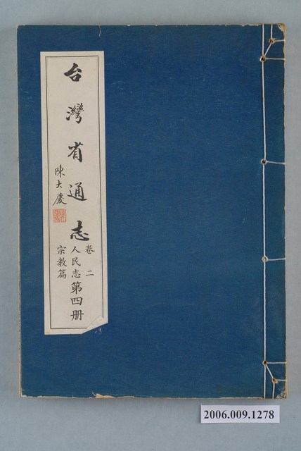 1.本物件為臺灣省文獻委員會出版的《臺灣省通志》卷二人民志宗教篇第四冊,採線裝裝訂。封面、封底底圖均為藍色。本篇共有10章,本冊敘述第10章通俗信仰,以及列出臺灣省主要寺廟一覽表之前半部。2.1948年6月,臺灣省通志館成立,由林獻堂任館長,主持臺灣省通志纂修事宜。1949年,臺灣省通志館改為臺灣省文獻委員會(簡稱省文獻會);1951年,內政部核備臺灣省通志稿纂修綱目,開始撰稿。先後在1960年完成大部分的篇章(斷限至戰後初期),以及1967年完成增修(斷限至1961年)。由於1960年的原修稿與1967年的增修稿作者眾多,難以連貫,相互牴觸之處不少,以致難以付梓,1966年,省文獻會成立整理小組,展開通志稿整修計畫,調整原志綱目,制定整修辦法,以省文獻會主任委員張炳楠為監修,副主任委員李汝和、林衡道為主修兼總編纂,開始整修計畫。1973年6月,臺灣省通志全書完成出版,不含卷首、卷尾,共10卷、10志、78篇、146冊,總字數約1,877萬字。本物件人民志宗教篇共有5冊,於1971年6月30日出版。