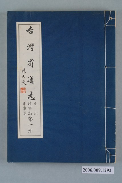 1.本物件為臺灣省文獻委員會出版的《臺灣省通志》卷三政事志軍事篇第一冊,採線裝裝訂。封面、封底底圖均為藍色,由目次可知內文分為役政、防戍、戰爭、武職等4章;本冊的內容是第1章役政,採縱向論述明鄭到戰後初期的役政。2.1948年6月,臺灣省通志館成立,由林獻堂任館長,主持臺灣省通志纂修事宜。1949年,臺灣省通志館改為臺灣省文獻委員會(簡稱省文獻會);1951年,內政部核備臺灣省通志稿纂修綱目,開始撰稿。先後在1960年完成大部分的篇章(斷限至戰後初期),以及1967年完成增修(斷限至1961年)。由於1960年的原修稿與1967年的增修稿作者眾多,難以連貫,相互牴觸之處不少,以致難以付梓,1966年,省文獻會成立整理小組,展開通志稿整修計畫,調整原志綱目,制定整修辦法,以省文獻會主任委員張炳楠為監修,副主任委員李汝和、林衡道為主修兼總編纂,開始整修計畫。1973年6月,臺灣省通志全書完成出版,不含卷首、卷尾,共10卷、10志、78篇、146冊,總字數約1,877萬字。本物件政事志軍事篇共有3冊,於1971年6月30日出版。
