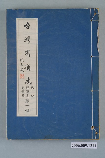 1.本物件為臺灣省文獻委員會出版的《臺灣省通志》卷四經濟志商業篇第一冊,採線裝裝訂。封面、封底底圖均為藍色,由目次可知內文分為市集交易、省內貿易、國內及國際貿易、光復初期諸設施、光復後本省商業、光復後對外貿易與收支等6章,本冊敘述的是第1章市集交易的全部內容,以及第2章省內貿易的前半部內容。2.1948年6月,臺灣省通志館成立,由林獻堂任館長,主持臺灣省通志纂修事宜。1949年,臺灣省通志館改為臺灣省文獻委員會(簡稱省文獻會);1951年,內政部核備臺灣省通志稿纂修綱目,開始撰稿。先後在1960年完成大部分的篇章(斷限至戰後初期),以及1967年完成增修(斷限至1961年)。由於1960年的原修稿與1967年的增修稿作者眾多,難以連貫,相互牴觸之處不少,以致難以付梓,1966年,省文獻會成立整理小組,展開通志稿整修計畫,調整原志綱目,制定整修辦法,以省文獻會主任委員張炳楠為監修,副主任委員李汝和、林衡道為主修兼總編纂,開始整修計畫。1973年6月,臺灣省通志全書完成出版,不含卷首、卷尾,共10卷、10志、78篇、146冊,總字數約1,877萬字。本物件經濟志商業篇共有3冊,於1970年6月30日出版。