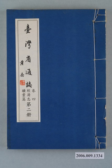 1.本物件為臺灣省文獻委員會出版的《臺灣省通志》卷四經濟志礦業篇第二冊,採線裝裝訂。封面、封底底圖均為藍色,由目次可知內文計有概說、金銀銅礦業、煤礦業、硫磺礦業、石油礦業、白雲石礦業、大理石及石灰石礦業、其他礦業等8章,本冊收錄的是最後4章石油礦業、白雲石礦業、大理石及石灰石礦業、其他礦業的內容。2.1948年6月,臺灣省通志館成立,由林獻堂任館長,主持臺灣省通志纂修事宜。1949年,臺灣省通志館改為臺灣省文獻委員會(簡稱省文獻會);1951年,內政部核備臺灣省通志稿纂修綱目,開始撰稿。先後在1960年完成大部分的篇章(斷限至戰後初期),以及1967年完成增修(斷限至1961年)。由於1960年的原修稿與1967年的增修稿作者眾多,難以連貫,相互牴觸之處不少,以致難以付梓,1966年,省文獻會成立整理小組,展開通志稿整修計畫,調整原志綱目,制定整修辦法,以省文獻會主任委員張炳楠為監修,副主任委員李汝和、林衡道為主修兼總編纂,開始整修計畫。1973年6月,臺灣省通志全書完成出版,不含卷首、卷尾,共10卷、10志、78篇、146冊,總字數約1,877萬字。本物件經濟志礦業篇共有2冊,於1969年6月30日出版。