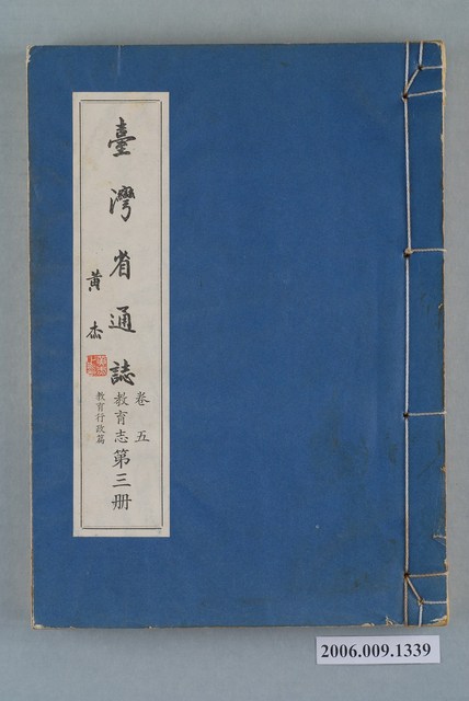 1.本物件為臺灣省文獻委員會出版的《臺灣省通誌》卷五教育志教育行政篇第三冊,書籍封面為藍色,右側書背處以黃色繩子進行線裝。內容主要以民國後的教育行政機關、措施、制度改制為主,包含國民學校、中等學校、專科學校、大學及獨立學院的行政組織紀錄。末頁書籍資訊文字說明出版資訊由臺灣省文獻委員會出版,臺灣省政府印刷場印刷,出版日期為中華民國五十八年六月三十日。2.1948年6月,臺灣省通志館成立,由林獻堂任館長,主持臺灣省通志纂修事宜。1949年,臺灣省通志館改為臺灣省文獻委員會(簡稱省文獻會);1951年,內政部核備臺灣省通志稿纂修綱目,開始撰稿。先後在1960年完成大部分的篇章(斷限至戰後初期),以及1967年完成增修(斷限至1961年)。由於1960年的原修稿與1967年的增修稿作者眾多,難以連貫,相互牴觸之處不少,以致難以付梓,1966年,省文獻會成立整理小組,展開通志稿整修計畫,調整原志綱目,制定整修辦法,以省文獻會主任委員張炳楠為監修,副主任委員李汝和、林衡道為主修兼總編纂,開始整修計畫。1973年6月,臺灣省通志全書完成出版,不含卷首、卷尾,共10卷、10志、78篇、146冊,總字數約1,877萬字。